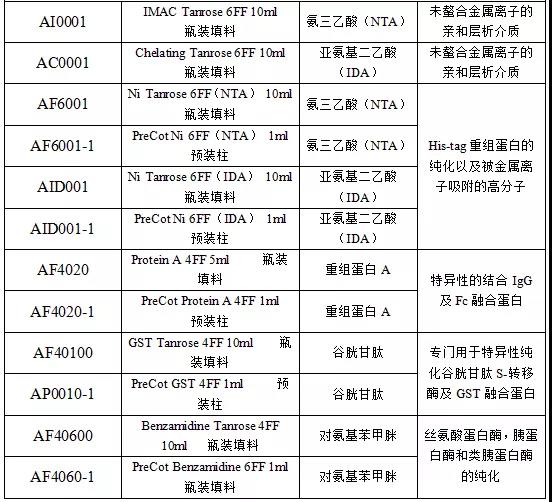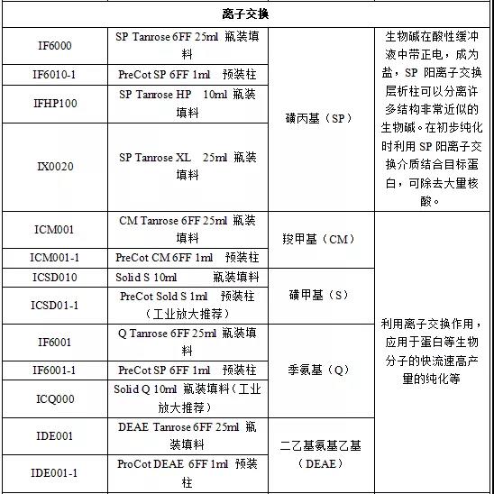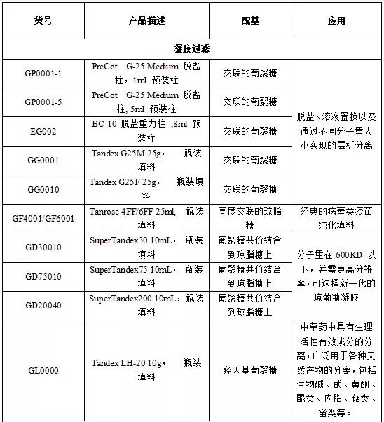 填料:瓊脂糖系列(Tanrose)、葡聚糖系列(Tandex)、高剛性瓊脂糖系列(Solid)、瓊脂糖葡聚糖系列(SuperTandex)等。